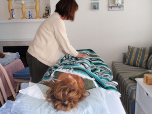 Reiki practitioners Ellen and Joyce are sharing Reiki with Renee and Debbie.